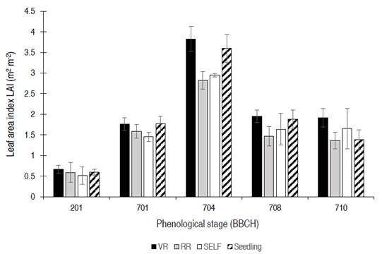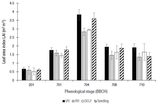 Leaf area index: when tomato plants reached their highest leaf development (704), significant differences were found between scion×rootstock combinations. The highest LAI was obtained by VR (3.8) compared to RR (2.8) and SELF (2.95), but similar to Seedling (3.6), indicating that the rootstock can modify the physiological components of yield in tomato, such as LAI (Figure 3). According to Heuvelink (2018), the optimal LAI for tomato plants is 4 to 5, values that were achieved for VR treatment at 704 phenological stage (3.8). From this moment of cultivation, it was necessary to carry out pruning to form the plant architecture and eliminate lateral shoots and diseased branches and leaves, thus, from this phenological stage (704), was evident an LAI reduction, with values remaining between 1.5 to 2.0, without significant differences between scion×rootstock combinations.