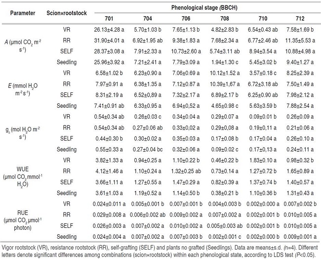 Both plants, at the beginning and end of development, non-statistical differences were observed in transpiration rate (E), with an average of 7 mmol H2O m-2 s-1, except to phenological stage 708, where the VR and RR treatments showed an increase 78% of E compared to self-grafted and non-grafted plants of the same age (Table 1).