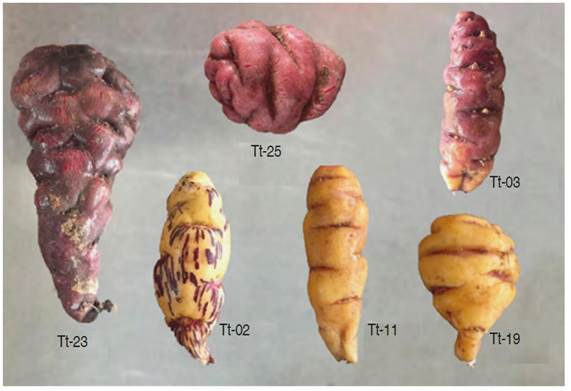 In Peru, Puno Region is the mean producer of mashua followed by the Cusco and Ayacucho Regions. It has a planting area of 4,828 ha that produces only 7,368 t year-1, compared to the potato production that is 742,924 t year-1 in the same region (Ministerio de Agricultura y Riego, 2018). This low production is due to its minimal demand since it has a bitter taste because of the presence of its glucosinolates (Martin and Higuera, 2016). Despite the fact that its planting area is less than those other Andean tubers, its cultivation is still important, since it is part of the food security of thousands of peasant families in the Andes through self-consumption or generation of income from the sale of this product (Apaza et al., 2020). Several studies recommend using it as a nutraceutical product or in the food preservation industry (Campos et al., 2006; Chirinos et al., 2007; Chirinos et al., 2008; Chirinos et al., 2015). In the Puno Region, one of the provinces with the highest production of mashua is Yunguyo. Therefore, the aim of this study was to characterize the physicochemical and antioxidant properties of six accessions of mashua (T. tuberosum R. & P.) of greatest economic importance in the province of Yunguyo (Puno Region, Peru), which vary according to the shape and color.