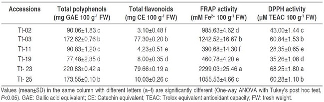 In the mashua accessions evaluated, the total flavonoid levels were ranged from 2.54 to 79.77 mg CE 100 g-1 FW. As shown in Table 1, the purple-colored mashua (Tt-23 and Tt-03) presented significantly higher content of total flavonoids (79.66±0.19 and 77.30±0.20 mg CE 100 g-1, respectively), approximately 8 times higher compared to the other mashua accessions evaluated (P<0.05). There are no reports on total flavonoid levels in mashua, however; some flavonoids such as flavan 3-ols, anthocyanins, flavones, flavonols and flavanones have been detected by high-performance liquid chromatography (Chirinos et al., 2008; Pacheco et al., 2019).