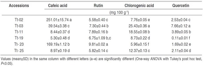 Table 2 shows the phenolic compounds analysis of the six accessions. The HPLC-DAD analysis showed detectable values for caffeic acid, rutin, chlorogenic acid and quercetin. As shown in Table 2, the highest levels of phenolic compounds were observed for caffeic acid, which ranged from 4.77 to 267.25 mg 100 g-1, lower levels were detected for the other phenolic compounds.
