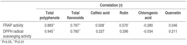 Other phenolic compounds have not been evaluated in mashua. The present study found an association between in vitro antioxidant activity and the content of phenolic compounds other than anthocyanins. Table 3 exposes th ecorrelation between in vitro antioxidant activity and levels of total polyphenols, total flavonoids and phenolic compounds identified. A significant correlation was observed between the FRAP activity and the total content of polyphenols and flavonoids (P<0.01), as well as with caffeic acid and rutin levels (P<0.05), while the DPPH activity was correlated with the total content of polyphenols and flavonoids (P<0.01) (Table 3). Furthermore, a significant correlation was observed between FRAP and DPPH radical scavenging activity (r=0.873, P<0.01, data not shown). These findings show that phenolic compounds other than anthocyanins could also contribute to the in vitro antioxidant activity presented by different accessions of mashua.