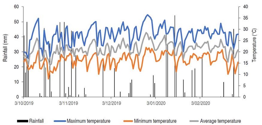 Weed control. It is known that the soil dynamics of pre-emergent herbicides are highly dependent on the edaphoclimatic conditions to which they are subjected. Precipitation of about 20 mm is critical for the herbicide to transpose the dry mass layer and be active in soil solution (Maciel and Velini, 2005). Moreover, there is a positive correlation between rainfall and the leaching of herbicide molecules, which may compromise the herbicide’s effect on target plants when they are in high volume (Monquero et al., 2008). Corn sowing and pre-emergence spraying were performed on the same day during October, with elevated rainfall and temperatures that year (Figure 1). These climatic conditions were favorable for the rapid emergence of crops and weeds. The weed number during the corn crop is provided in Table 3.