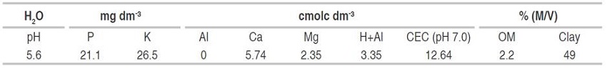 General description. The experiment was performed in Sertão/RS - Brazil (28°03'18" S and 52°14'53" W), at 670 masl. The climate of the region according to the Köppen classification is "Cfa", with 17.8 °C average annual temperature and 1.791 mm of average annual rainfall. The soil of the site is classified as Deep Dystrophic Red Nitossol, with 49% of clay and 2.2% of organic matter, according to soil collection and analyses shown in Table 1.
