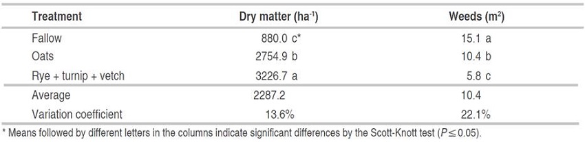 Dry matter and weeds in the winter period. Regarding the dry mass in the fallow, the production was mainly originated from weeds that emerged during the winter, predominantly ryegrass (Lolium multiflorum L.) (Table 2). This treatment showed high variation in density and weed flow, producing low dry mass, even when samples with a high number of plants m-2 were collected, indicating a higher variation. In some plots, more than 100 plants m-2 were counted, demonstrating the high germination rate of this species that are widely present in the seed bank mainly in southern Brazil.