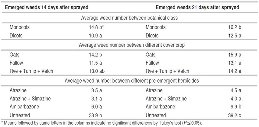 Sample collection and evaluations during cover crop period. The dry mass of the cover crops was determined within a square of 0.5 × 0.5 m. These samples were collected in each plot 30 days before corn was planted and harvested at the soil level. The weed number was counted on the same day. The cover crop samples were placed in an oven at 65 °C until a constant mass was obtained. The dry mass for each plot was weighed and the weed number was used for the statistical analysis in each cover crop treatment.