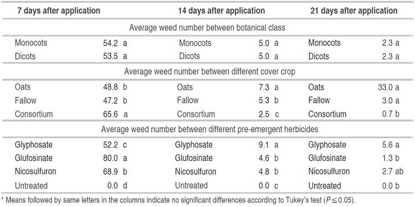 Intercropping pattern improves weed control. It seems a good alternative since besides enabling a higher biomass production and providing benefits related to soil conservation, helps in moisture maintenance and nutrient cycling and also decreases weed number. It does this by increasing herbicides efficacy and biological decomposition activity, as well as the decomposition of weed seeds present in the soil bank, and by providing a physical barrier that prevents the stimulation of emergence, especially in weed species with positive photoblastic characteristics (Chu et al., 2017; Chahal and Van Eerd, 2018; Ottavini et al., 2019).