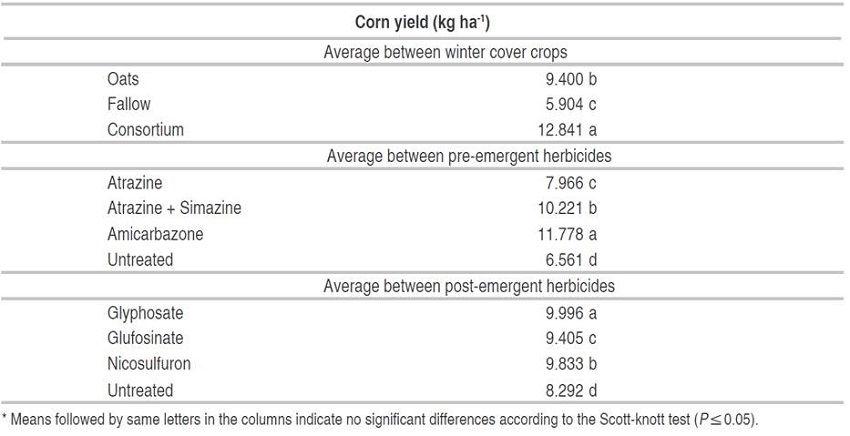 The pre-emergent herbicides used on corn were non treated; atrazine (2.5 kg a.i. ha-1); atrazine + simazine (1.625 + 1.625 kg a.i. ha-1) and; amicarbazone (0.14 kg a.i. ha-1). The post-emergent herbicides on corn were non treated; glyphosate (1.92 kg a.i. ha-1); ammonium glufosinate (0.4 kg a.i. ha-1) and; nicosulfuron (0.08 kg a.i. ha-1).