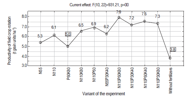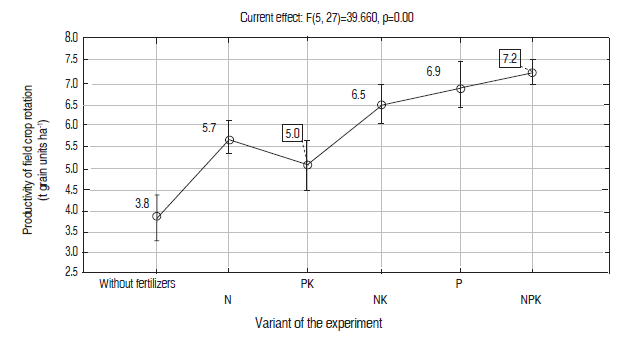 Crop rotation can work effectively only under conditions where substances and energy are returned to circulation, which creates optimal nutrition conditions for plants to obtain high yields. The research has shown that the regular application of different rates and combinations of mineral fertilizers in the field crop rotation improves considerably its productivity (Figure 1). The application of nitrogen-potassium, nitrogen-phosphorus, and complete mineral fertilizers influenced the productivity of the field crop. On average, the application of nitrogenous fertilizers increased the productivity of crops rotation by 1.5 times, phosphorus-potassium by 1.3 times, nitrogen-potassium by 1.7, nitrogen-phosphorus by 1.8 times, and complete mineral fertilizer by 1.9 times.