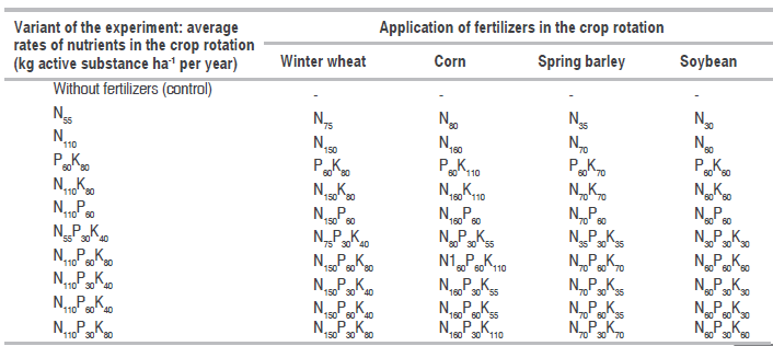 The stationary field experiment was carried out at the Uman National University of Horticulture (certificate of the National Academy of Agricultural Sciences No. 87) (Stationary field experiments of Ukraine, 2014) in the Right-Bank Forest Steppe of Ukraine with Greenwich geographical coordinates 48°46' of northern latitude and 30°14' of eastern longitude. The experiment was started in 2011. The following crops were cultivated in the four-field crop rotation: winter wheat (Triticum aestivum L.), corn (Zea mays L.), spring barley (Hordeum vulgare L.), and soybean (Glycine max Moench.). The field experiment aims to establish the efficiency of the action of different types, rates, and proportions of mineral fertilizers on the yielding capacity and quality of grain and seeds of field crops, and fertility of the black soil. The scheme of the experiment includes 11 variants of combinations and separate applications of mineral fertilizers including the control variant without fertilizers (Table 1).