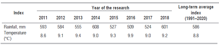 The amount of rainfall was by 1-4% higher over three years, it was 4-11% lower over the rest of the years compared to the average long-term index (Table 2). The air temperature was higher (2-7%) than the long-term average except for 2011.