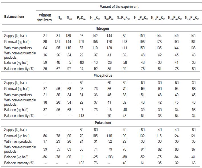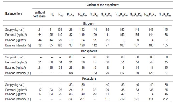 Thus, optimal nitrogen balance with 100-107% intensity was achieved when nitrogen was applied annually with mineral fertilizers 110 kg ha-1 in different combinations with phosphorus and potassium (P30-60K40-80).