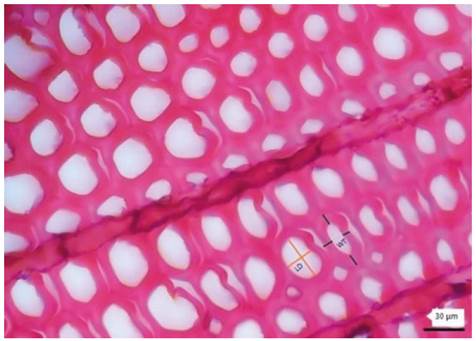Pieces of samples of unmodified and thermally modified wood were cut into lengths of 20×20×20 mm and soaked in tap water for 36 h. A transverse slice of 20 µm was obtained using a Spencer Model 860 microtome (AO Instrument CO, Buffalo, N.Y, USA). These sections were stained with a 1% safranin solution and mounted on a glass slide and cover glass using Canada balsam and glycerin. Anatomical measurements were performed at the Forest Products Laboratory of the Universidad Nacional de Colombia, Medellín, Colombia. The changes in the cellular structure of wood were examined using a Primo Star light microscope (Carl Zeiss Microscopy GmbH, Oberkochen, Germany). All measurements were made in triplicate. The cell wall thickness and lumen diameter for early and latewood were measured in 12 measurements per sample from heat-treated and unmodified Pinus oocarpa wood (Figure 1).