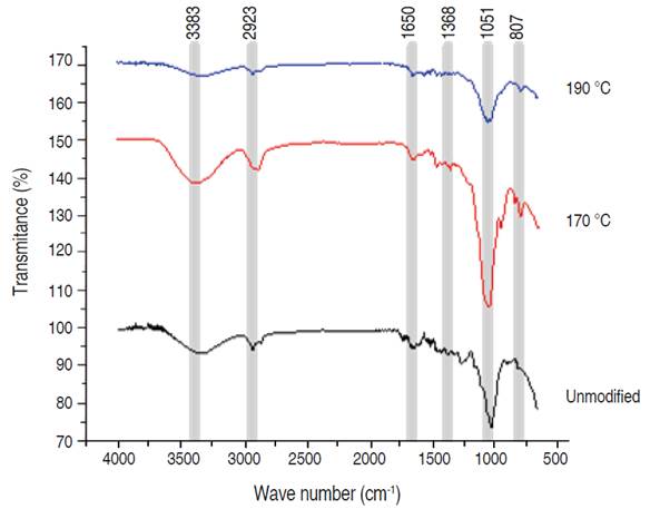 Thermally modified Pinus oocarpa wood presented a higher number of extractives and insoluble lignin than unmodified wood, in addition to presenting lower contents in the polysaccharides formed by holocellulose, also for modified wood (Table 1); the holocellulose content decreased by 7% in the wood treated at 170 °C, similar to those obtained by Durmaz et al. (2019) and Wang et al. (2018) in Pinus sylvestris and Pinus massonica woods; and for thermal modification, at 190 °C decreases of 9% were detected, equal to those achieved by other authors in heat-treated wood (Ding et al., 2011), no significant differences were found between the modified treatments; while, significant differences were found for the treated and untreated wood. These results disagree with those reported by Carvalho et al. (2020) in Pinus oocarpa found less content of holocellulose but heat-modified wood showed a significant decrease of holocellulose only at temperatures above 200 °C. These decreases were due to the deacetylation and formation of acetic acid, which acts as a catalyst for depolymerization reactions and accelerates the degradation of polysaccharides (González-Peña and Hale, 2009).