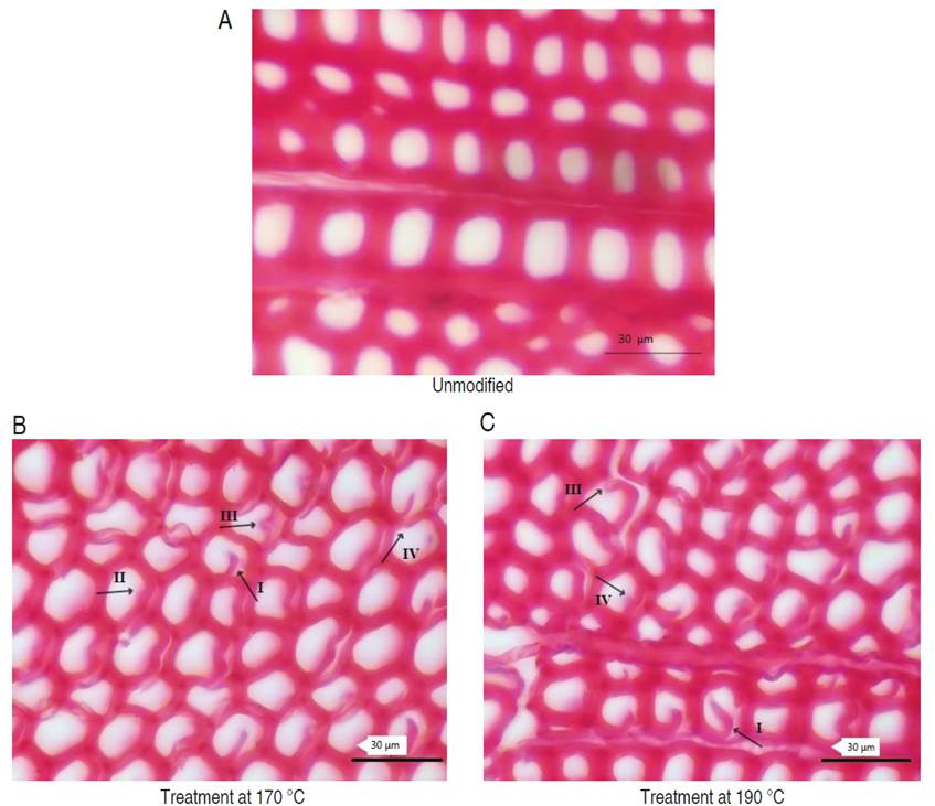 Morphological changes in the anatomical structure of thermally treated Pinus oocarpa wood, compared to the unmodified condition are shown in Figure 3. Cracks and small voids between tracheids were noticed when applied the modification treatment at 170 °C (Figure 3A), in addition, crushing of the cell lumens and cell deformations were noted. Cabezas-Romero et al. (2021) reported for the modified Pinus radiata wood slight crushing of cellular lumens, small cracks and the presence of broken cells and also cell deformations. Through the thermal modification at 190 °C, an increase in the morphological changes of Pinus oocarpa wood was presented, which affects its use and potential assessment due to the presence of higher cell deformations, large cracks, as well as an increase of the breaking and destruction of the tracheid walls; a similar phenomenon was also reported by Awoyemi and Jones (2011) in Thuja plicata wood.