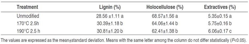 In most studies about thermal modification, independent of the wood species considered, there are alterations in the chemical composition, and the heat treatment is determinant in the results. Thus, when applying heat treatments between 170 °C and 190 °C under steam pressure, there is a decrease in holocellulose content caused by its degradation; but, due to said such thermal degradation, lignin and extractives increase because of the formation of carbohydrate conversion products in the modified wood of specimens of Pinus sylvestris, Pinus brutia and Pinus massoniana (Boonstra MJ and Tjeerdsma, 2006; Durmaz et al., 2019; Ates et al., 2009; Wang et al., 2018). However, for Pinus oocarpa themally modified significant differences in chemical components were detected just from 200 ºC temperature (Carvalho et al., 2020).