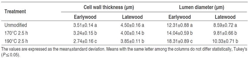 Table 2 shows the anatomical measured values of cell wall thickness and the lumen diameter for the earlywood and latewood of thermally treated and unmodified Pinus oocarpa wood.