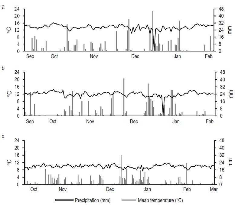 The study was carried out in the South of the department of Nariño - Colombia, with evaluations in three of the four homogeneous environments characterized by Marcillo et al. (2021), for the potato-producing area (AH1, AH2 and AH4, respectively), which have particular edaphoclimatic characteristics of altitude, precipitation, temperature, slope, texture and soil pH (Table 1). The experimental plots were located in farmers' properties in the municipalities of Guaitarilla, Providencia and Guachucal, respectively. The climatic conditions in each environment evaluated were: in Guaitarilla (AH1) an accumulated rainfall of 543.9 mm, distributed throughout the crop cycle and an average daily temperature (ADT) of 13.7 °C (Figure 1a); in Providencia (AH2) an accumulated rainfall of 534.8 mm, with little rainfall at the beginning and end of the crop and an ADT of 12.1 °C (Figure 1b), lower than the historical range and, in Guachucal (AH3), accumulated precipitation of 479.4 mm, with low rainfall regimes at the end of the crop and an ADT of 9.9 °C (Figure 1c).