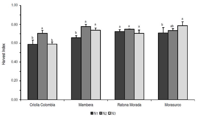 Regarding HI results, the interaction level by cultivar was only significant in AH4 (Table 4; Figure 2); level N2 obtained higher HI for Criolla Colombia and Mambera, while N3 for Morasurco. Under harvest stages similar to those of the present study (senescent plant), Santos (2010) obtained values in Phureja genotypes from 67 to 73% at 2859 masl and from 51 to 66% at 2572 masl, ranges similar to those found in the present work.