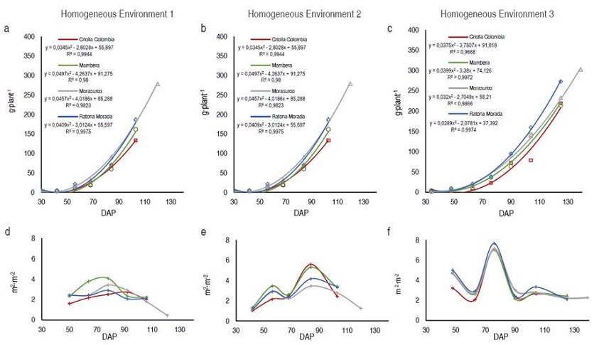 In the three environments, dry matter accumulation of all cultivars was adjusted to a quadratic model (Figure 3 a-c), with highly significant adjustments (R2=0.97; P<0.01). In AH1 and AH2 the length of the growing season was similar, but dry matter accumulation was lower in AH2. At the end of the cycle, the cultivar with the lowest dry matter accumulation in AH1 was Criolla Colombia (176.9 g plant-1), followed by Mambera (250.5 g plant-1) and Ratona Morada (288.5 g plant-1) and the highest accumulation was in Morasurco with 350.2 g plant-1 (Figure 3a), and a cycle 15 days longer than the other three. For environments AH2 and AH4, dry matter accumulation was in the same order, with lower values for Criolla Colombia, followed by Mambera, Ratona Morada, and Morasurco, with 133.3 g plant-1, 161.8 g plant-1, 186.6 g plant-1 and 278.7 g plant-1 in AH2 (Figure 3b) and 218.9 g plant-1, 213.9 g plant-1, 272.7 g plant-1 and 302.8 g plant-1 in AH4 (Figure 3c), respectively.