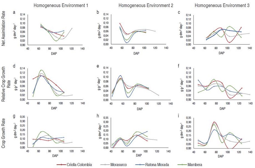Similarly, in AH1, the highest value of CGR expressed as weight gain per unit area and time, occurred at different times in each cultivar and environment: for Mambera at 64 DAP (0.18 g dm-2 day-1), Morasurco at 78 DAP (0.14 g dm-2 day-1), Criolla Colombia 92 DAP (0.10 g dm-2 day-1) and Ratona Morada at 106 DAP (0.12 g dm-2 day-1). The last two presented the most stable growth throughout the cycle (Figure 4g). The CGR in AH2, in agreement with the RGR, presented two periods of increase in the rate, the first at 56 DAP and the second later at 84 DAP (Figure 4h). The four cultivars presented the highest growth rates in AH4, at 76 DAP, where 0.301 g dm-2 day-1 was registered in Criolla Colombia, 0.273 g dm-2 day-1 in Mambera, 0.287 g dm-2 day-1 in Morasurco and 0.213 g dm-2 day-1 in Ratona Morada. A second stage occurred in Ratona Morada and Mambera at 104 DAP (Figure 4i).