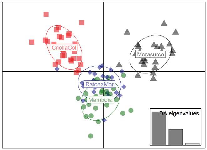 Two main groups can be found in the biodiversity of cultivated potatoes. The first group includes the so-called traditional or native varieties, which are the result of a process of domestication, selection, and ancestral conservation, and are generally associated with marginal production zones in high altitude or moorland areas. In the second are located the varieties that result from a process of genetic improvement; these possess attributes in terms of yield potential, resistance to phytopathogens, and organoleptic characteristics, among others (Monteros and Reinoso, 2010). The results evidenced in the present study agree with this classification. The genetic variability is represented initially by the Andigena group, with the variety Morasurco, coming from genetic improvement, while in the Phureja group the variety Criolla Colombia is a variety improved by clonal selection, which is separated from Ratona Morada and Mambera, which are traditional or native cultivars (Figure 5).
