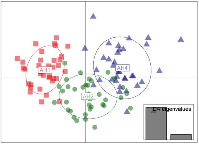 Considering yield and DAPC, differences in behavior were observed for the Morasurco cultivar with respect to the Phureja cultivars and within this group Criolla Colombia differed from the other two. The productivity of the evaluated cultivars was mainly influenced by the environments. Ratona Morada and Mambera are alternatives for high zones because they presented higher yield in AH4, an aspect possibly associated with its traditional character, which suggests better adaptation in high zones and, on the contrary, Criolla Colombia when evidencing better yield in AH1 and AH2 indicates its adaptation with respect to zones of higher altitude. Morasurco presented a similar behavior in the three environments, indicating wide adaptability of the cultivar in different productive conditions.