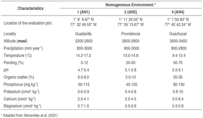 Marcillo et al. (2021) and Benavides et al. (2021) compiled relevant information and research results regarding potato cultivation in the department of Nariño, Colombia. In this sense, it is highlighted the definition of four zones or homogeneous environments with particular edaphoclimatic characteristics. These have among them differences in the mineral composition of the soils, management practices and socio-cultural aspects, which imply diversity of responses of the genotypes identified as predominant in the potato zone of the department.