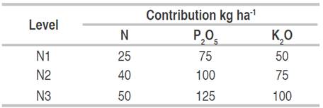 An experiment was established in each environment under a randomized complete block design with a split-plot arrangement and three replications. The main plot included three fertilization levels based on input from average soil analyses for the area and requirements of commercial varieties (Table 2) and the subplot included the four cultivars mentioned above. The experiments were established considering a planting density of 33.333 plants ha-1. Each experimental plot occupied an area of 42 m2, of which 25 m2 were used for the evaluations.