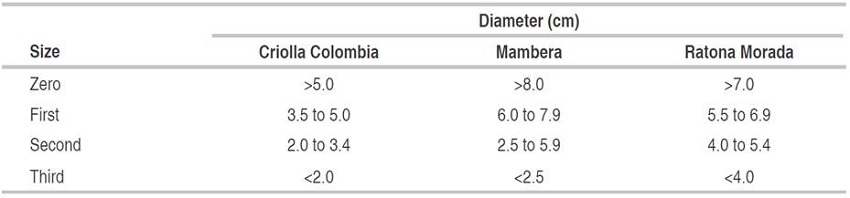 In each experimental unit, in addition to the total yield, the number, size, and weight of tubers were recorded. A tuber size scale was generated for the cultivars of the Phureja group, according to the commercial classification in the area (Table 3). For Morasurco, the Colombian Technical Standard NTC 341 (ICONTEC, 1996) was used. The results of tubers of size zero and first in a single group were considered because they represent a higher commercial value.