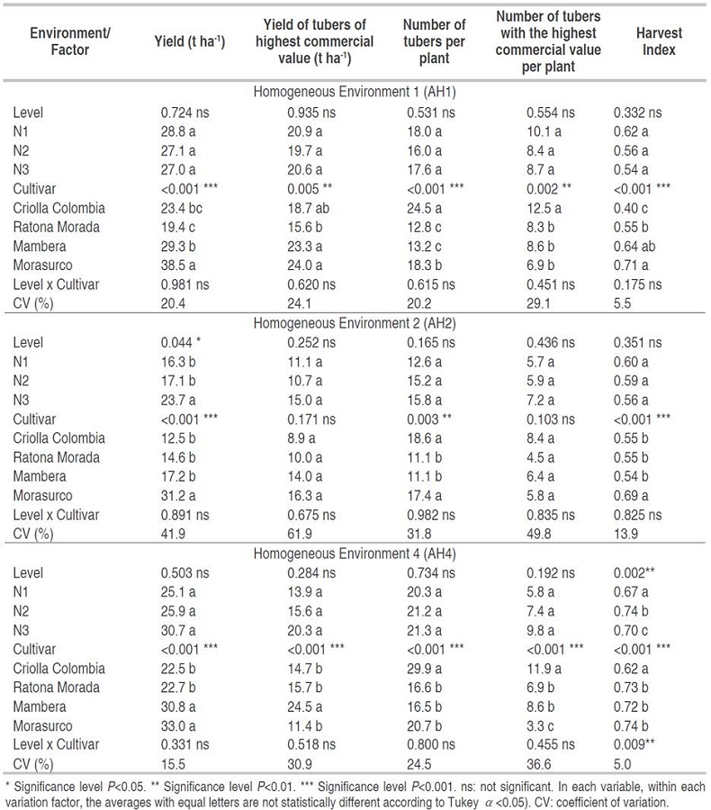In environment AH1 the highest yield was reached by Morasurco (38.5 t ha-1) and the lowest by Ratona Morada (19.4 t ha-1). The yield of tubers of greater commercial value (size zero and first) of Criolla Colombia was 18.7 t ha-1, which represents 80% of its total yield, contrasting with 24.0 t ha-1 in Morasurco, corresponding to 62%. In the number of tubers per plant, Criolla Colombia presented the highest value (24.5), while at the other extreme, Mambera and Ratona Morada presented 13.2 and 12.8, respectively. The HI for this environment ranged between 0.40 and 0.71, with statistical differences between Criolla Colombia (0.40) and the other cultivars.