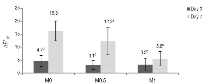 The total color difference was affected by the OSs on day 0 (∆E*ab 0) and on day 7 (∆E*ab 7) (P≤0.05) (Figure 1). There was a perceptible color difference for M0 samples with respect to untreated fresh-cut apples and fairly perceptible color differences for M0.5 and M1 on day 0. After 7 days, ∆E*ab 7 values showed strong differences for M0 and M0.5 treatments, but only perceptible differences for M1 treatment, which had the highest content of AA and CA. In this sense, it is well known that the use of antioxidant compounds contributes to the maintenance of visual attributes, preventing discoloration due to enzymatic browning (Betoret et al., 2015; Rodríguez-Arzuaga and Piagentini, 2018).