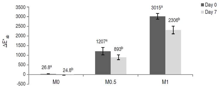No significant differences in pH between days 0 and 7 were observed in M0 treatment. Nevertheless, for M0.5 and M1 treatments, the ∆pH on day 7 was 1.5 times higher than on day 0. These results agree with those of Cortez-Latorre et al. (2021), who reported a decrease in pH, both on days 0 and 7 (7.7 and 5.1%, respectively) for VI fresh-cut apples with an OS of sucrose with an addition of 1% AA and 1% CA, under the same pressure and time conditions as in the present work.