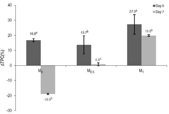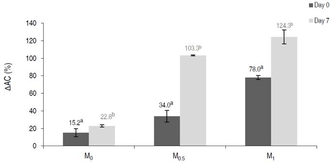 The relative variation percentage of antioxidant capacity (∆ACi) was influenced by the OS (P≤0.05). On day 0, the M1 treatment generated the highest increase of ∆AC0. On day 7, M0.5 and M1 generated similar increases, which were higher than in M0 (Figure 4). Similar results were obtained on day 7, with the increase in antioxidant capacity caused by M1 and M0.5 being approximately two times higher than fresh cut apples.