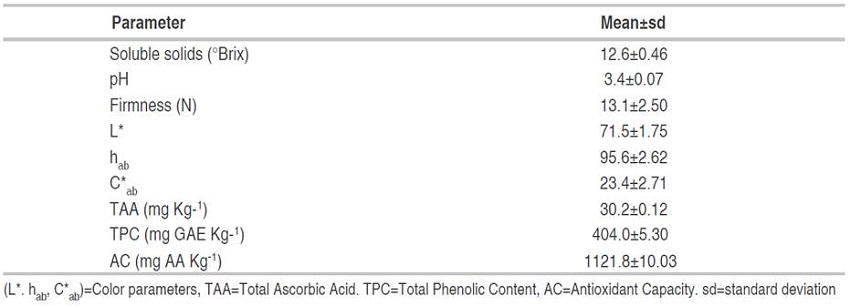 The soluble solids (SS), pH, firmness, color parameters (L*. hab, C*ab), Total Ascorbic Acid (TAA), Total Phenolic Content (TPC) and Antioxidant Capacity (AC) for fresh-cut fruit are presented in Table 2.