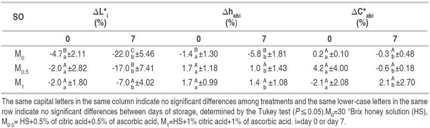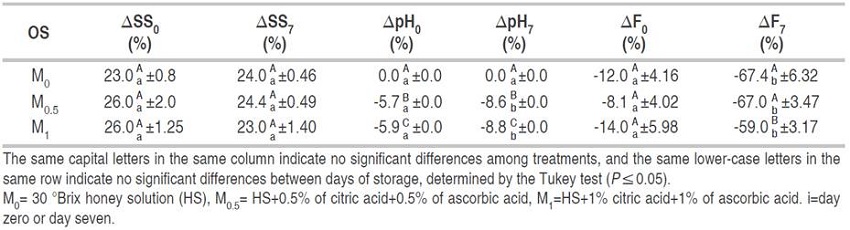 There were significant differences in SS between days 0 and 7 for M0 treatment (P≤0.05) (Table 3). Conversely, M0.5 and M1 treatments did not show differences between days 0 and 7 of storage at 1.5 °C. Granny Smith fresh-cut apples impregnated with 50 °Brix honey OS, 700 mbar, VT=10 min, and RT=10 min showed an increase of SS of about 50-70%, remaining stable after 7 days of storage (Rößle et al., 2011). They found good adherence of honey OS to fresh-cut fruit, which allows the values to remain stable during storage. Similar results in the M0.5 and M1 treatments.