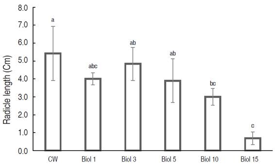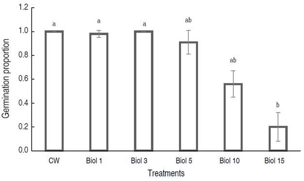 This variable was significantly (P<0.05) reduced by Biol 15 (0.20±0.12). Meanwhile, Biol 5 and Biol 10 (0.91±0.10 and 0.56±0.11) did not differ significantly from the Biol 15 and CW, although showing a tendency to affect germination. The values obtained with dilutions of Biol 1 and Biol 3 (0.98±0.03 and 1.00±0.00) presented no differences regarding to CW (1.00±0.00, Figure 1).