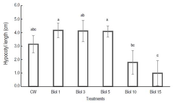 In this case, none of the dilutions differed significantly from the CW. However, at concentrations 1, 3 and 5% (4.17±0.54; 4.12±0.79 and 4.09±0.41 cm), hypocotyls were significantly longer than 15% (0.99±0.94 cm), showing values higher than CW (3.14±0.64 cm, Figure 2).
