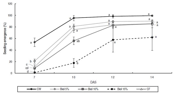 At 7 days, all treatments obtained significantly lower values than the control (53.5±7.37%). At 10 days, only the Biol 15 differed from the rest of the treatments with the lowest values. After 10 days, no statistical differences were observed among the treatments and the CW, although the trend observed at the beginning of the emergency assessment was maintained (Figure 4).