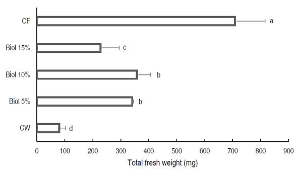 The fresh biomass obtained in the seedlings after 28 days, showed a significantly higher response for fertilized control (CF), while CW presented lower values than the rest of the treatments. On the other hand, the solutions of Biol 5 and 10% (340.66±49.69; 357.75±67.26 mg) obtained a fresh weight lower than CF (707.79±108.34 mg) but significantly higher than Biol 15% (227.21±4.03 mg, Figure 5).