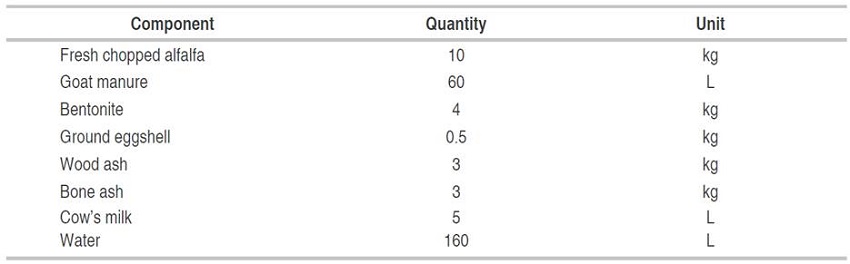 The bioslurry was elaborated according to the methodology for "enriched liquid biofertilizer" preparation, proposed by the FAO (2013). To do this, a 220-liter plastic drum was used, where the components, listed in Table 1, were placed. Anaerobic digestion was performed for four months. The mixture was stirred weekly to homogenize the materials. At the end of the elaboration process, the mixture was filtered by a canvas fabric, and the liquid fraction was stored in a plastic drum with hermetic closure, protected from direct radiation. The final composition of the bioslurries in solution is presented in Table 2.