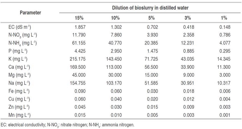 The treatments were: fertilization with a 5% solution of bioslurry (Biol 5); 10% solution of bioslurry (Biol 10); 15% solution of bioslurry (Biol 15); control with well-water (CW) and a fertilized control (CF), supplemented with nutrient complexes (Rootex 8-46-5.5, Cosmoflor S. A., Mexico, and Plant-Prod Iniciador, 10-52-10), Cosmoflor S. A., Canada, both dissolved at 2 g L-1 in irrigation water. Prior to the incorporation, electrical conductivity expressed as dS m-1 was measured in each treatment at 23 °C, obtaining CW: 1.070; Biol 5: 1.772; Biol 10: 2.372; Biol 15: 2.927 and CF: 2.280. The experimental design used was completely randomized with 15 experimental plots, where three replications were arranged per treatment. The effect of treatments on the emergence and development of seedlings was evaluated by analysis of variance and comparison of means (Fisher's LSD test; P<0.05), using the Infostat statistical software.
