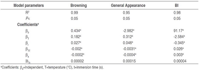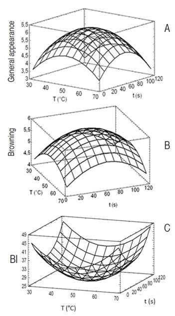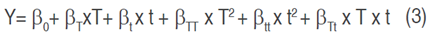 Where: β0, βT, βt, βTT, βtt and βTt are the regression coefficients while T and t are the variables under study. The responses studied (Y) on each eggplant slice were general appearance, browning and browning index.
