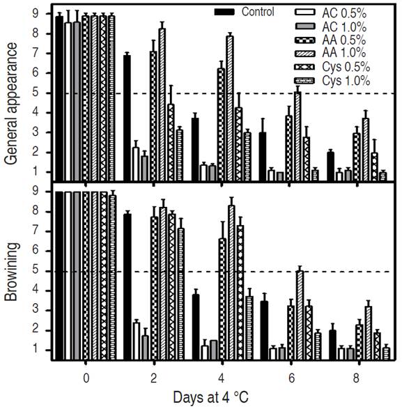 Control samples reached the cut-off point before 4 days of storage, due to excessive browning, affecting the general appearance. Eggplant slices treated with AA at both concentrations presented very good scores on the general appearance and browning on day 4 of storage. However, on day 6, only the concentration of 1% allowed to preserve acceptable characteristics for commercialization, with values close to 5 (limit of acceptability). Therefore, the antioxidant effect of AA solutions was dependent on the concentration used. This agrees with what was reported by Ghidelli et al. (2014), who reported that the use of AA in persimmon at 1.12% and 2.25% allowed reaching a marketability limit of up to 7 and 5 days, respectively. Similarly, the same trend was observed in eggplant cv. Telma cut into cubes, since the 0.35 and 0.88% AA concentrations showed better results in color maintenance than the control (untreated), while 1.75% AA increased the browning of the fruits (Ghidelli et al. 2013).