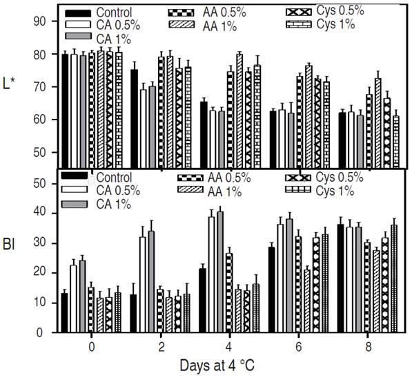 Different authors have used the values of lightness (L*) and browning index (BI) for describing browning in vegetables, the latter being a good indicator of the darkening of the samples due to increased pigments concentrations (Arias et al. 2008). The surface color parameters L* and BI for the eggplant slices treated with different antioxidant solutions were evaluated during storage (Figure 2). Browning was accompanied by a decrease in L* and an increase in BI.