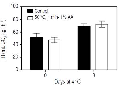 Dipping treatments in a solution containing 1% AA was considered as the best antioxidant solution, since can effectively reduce browning of fresh-cut eggplants up to 6 days of storage at 4 °C. However, the combined application of HWD at 50 °C for 60 s followed by dipping in solution of 1% AA, allowed control for longer time the browning of fresh-cut eggplants without significantly affecting the RR, extending their shelf life up 8 days at 4 °C. The positive effect of HWD+1% AA on browning control and color retention of eggplant slices was related to low levels of enzyme activity of PPO and POD. Furthermore, the phenols content was significantly increased by applying this optimized treatment, but without effect on its antioxidant capacity. These results suggest that hot water dipping treatment (50 °C, 60 s) combined with 1% AA can be considered a good alternative to maintain the overall appearance and browning control of fresh-cut eggplants.