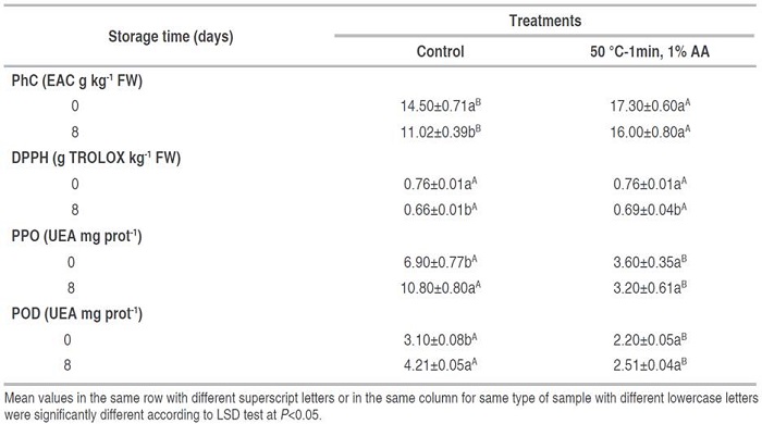 Phenolic compounds (PhC) are a group of secondary metabolites belonging to the plant kingdom, of great functional value due to their antioxidant action (Goyeneche et al. 2015). As a result of the application of optimized treatment, PhC values were initially significantly higher than those of the control by approximately 20% (Table 2).