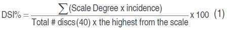 The leaf discs were assessed 3, 5, and 7 DAI, utilizing the Scale Degree according to Nyassé et al. (1995). The average values from the scale were then employed to calculate the disease severity index (DSI) of each clone, using the McKinney index equation (McKinney 1923) in Equation (1) as follows.