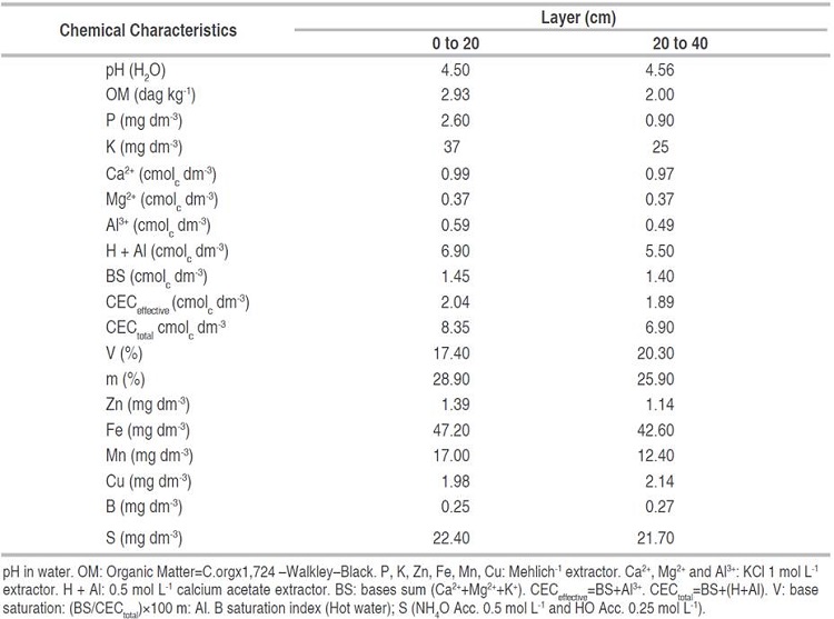 The plants were grown in 2.5x2.5 m spacing, in a rainfed system and free from weed competition and pest and disease attacks. Chemical fertilization was carried out by chemical analysis of the soil after collecting samples in layers from 0 to 20 and from 20 to 40 cm (Table 1). The recommendation was made according to Dias et al. (2007)} quoted by Silva et al. (2021)}, where 100 g plant-1 of the 20-10-15 N-P-K formula was applied at the time of planting.