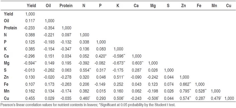 Table 2 shows the Pearson's correlation coefficient (r) between grain yield, oil, protein and leaf macro and micronutrient contents. As for grain yield, statistical significance (P<0.05) was found only for leaf Mg content (r=-0.594). This association can be explained by two hypotheses: the first corresponds to the reduction of Mg levels due to fruit production, since Mg is easily translocated to regions of active growth; the second is the reduction in productivity due to the increase in the concentration of Mg in the tissues. According to Hawkesford et al. (2022)}, the demand for Mg is high in the reproductive growth stage, since the transport of photoassimilates is influenced by the Mg content and, the distribution of carbohydrates between the source and drain organs can be negatively affected if the Mg contents are insufficient for the fruit formation demand.
